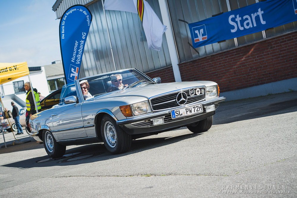 Der Eventtag begann um 9:30h auf dem Gelände der Firma BMW Raudzus, die neben der Husumer Volksbank das Treffen unterstützte. Nachdem sich alle Teilnehmer bei Kaffee & Brötchen gestärkt hatten, machte sich die Fahrer mit Ihren Gefährten auf den Weg zu einer kleinen Rundtour über die nordfriesische Halbinsel Eiderstedt. Zu diesem Zeitpunkt hatte ich bereits einige schöne Detailaufnahmen der Oldtimer im Kasten und konnte mich dann ganz auf die Dokumentation der Abfahrt konzentrieren,