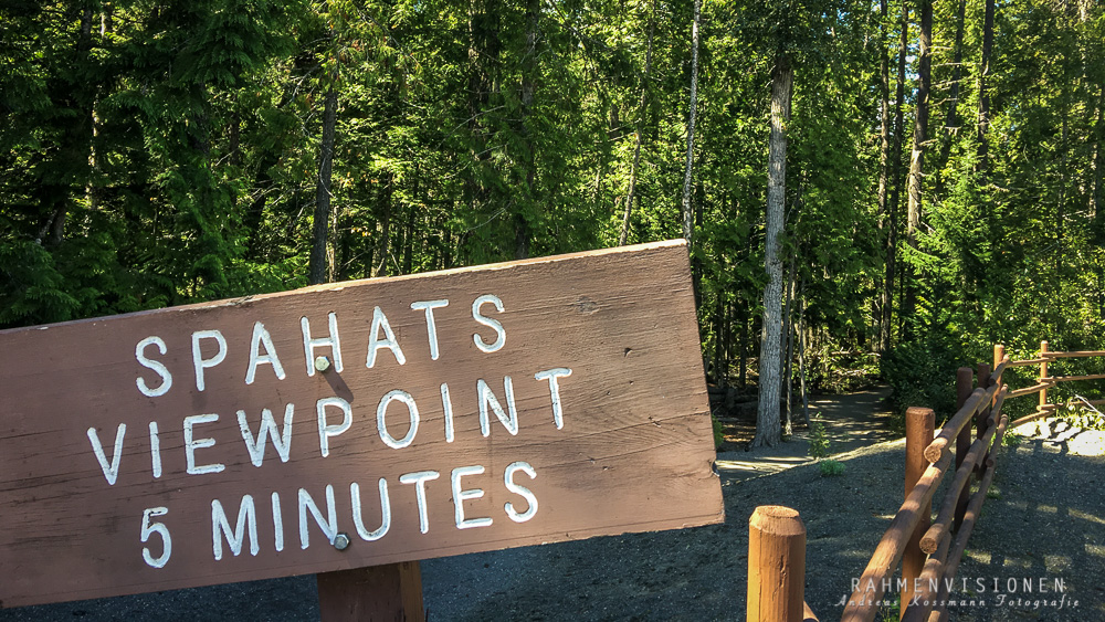 Bereits gegen 11h fuhren wir am Dutch Lake auf den gleichnamigen Campground. Wir bekamen einen schönen Platz mit Blick auf den See zugewiesen und genossen die Aussicht bei einer Tasse Kaffee. Wir nutzten die verbleibende Zeit des Tages für einen Abstecher in den nahegelegenen Wells Grey Provincial Park. Dort machten wir Halt auf einem Parkplatz, von wo aus man zu Fuß zu den Spahats Falls laufen konnte. Von einer kleinen Lichtung aus, bekamen wir zunächst einen tollen Ausblick über das Flusstal des Clearwater River. Die kurze Wanderung durch den Wald bis zu den Falls dauerte ca. 30 Minuten. Auf dem Weg kam uns ein kanadischer Typ mit seinem Hund entgegen. Der Mann sprach uns an und fragte interessiert nach unserer Herkunft. Mit der Information, dass wir aus Deutschland kommen ließ er sich zu der Frage hinreißen, ob wir jetzt ausgewandert wären. Wir blickten uns kurz fragend an… Wieso jetzt? Na, das wäre doch jetzt alles so fürchterlich da mit dem Terror durch die Muslime und den ganzen Protesten (PEGIDA, Anm. der Redaktion). Oh! Solch ein tolles Bild von Deutschland wird also in den internationalen Medien vermittelt. Wir relativierten die Situation etwas und ließen ihn dann aufgeklärt von dannen ziehen. Sein Hund war ihm bereits vorausgeeilt.